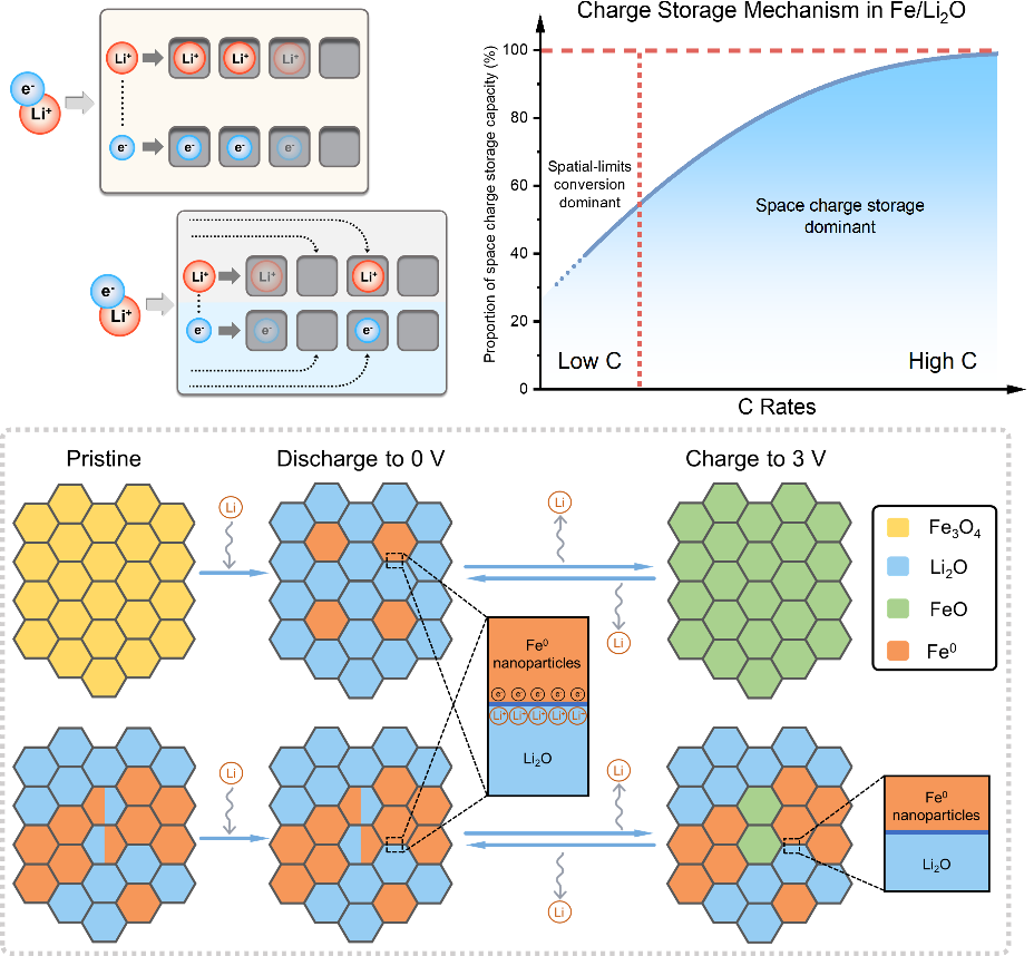 随着电动汽车和便携式电子设备的快速发展和大规模生产使用,开发具有快速充电能力和超长稳定循环能力的锂离子电池是目前科学研究的重点。但通常为了实现高倍率的充放电性能往往伴随着电池能量密度的牺牲。在这项工作中,研究人员基于空间电荷存储机制,成功构建系列电子导体/离子导体电极材料(Fe/LixM (M=O, F, S, N)),同时兼具高能量密度、高倍率性能和高循环稳定性。通过热力学拟合结合磁学测试,提出了人工电子/离子导体电极材料的Li插入优势机制调控原则,并建立了相应机制模型。这项研究创造了一种可行的方法,将卓越的空间电荷存储机制引入到了快充电极材料的设计中,可以弥合当前电极材料与未来电池应用日益增长的要求之间的性能差距矛盾,同时证明了空间电荷存储在下一代超快充电储能系统中的潜在可行性。