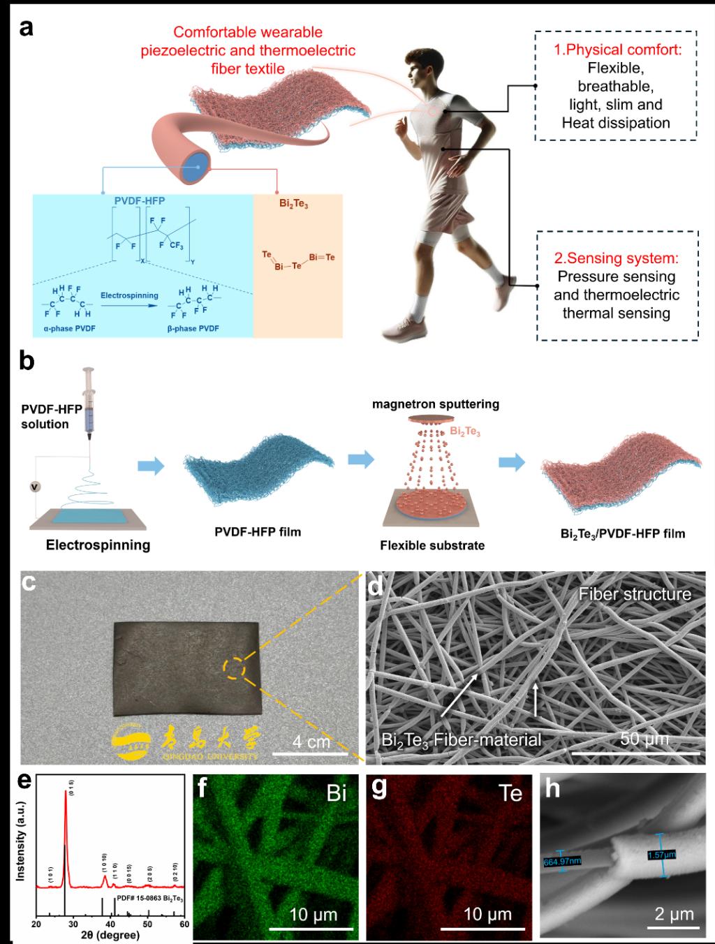 近年来,柔性可穿戴设备研究日益聚焦于自供电技术(例如压电纳米发电机和摩擦电纳米发电机),以替代传统电池,提升便携与环保性。热电发电机能够将人体或环境中的热能转化为电能,成为研究热点。然而,传统热电材料虽输出性能优异,却因脆性高、透气性差、功能单一等问题,限制了其在柔性穿戴领域的广泛应用。