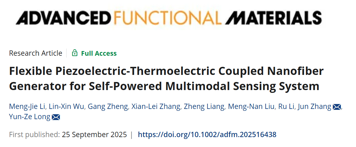 龙云泽、张俊课题组在国际著名期刊《Advanced Functional Materials》(2025, DOI: 10.1002/adfm.202516438)上发表了题为“Flexible Piezoelectric‐Thermoelectric Coupled Nanofiber Generator for Self‐Powered Multimodal Sensing System”(柔性压电-热电耦合纳米纤维发电机用于自供电多模态传感系统)的研究论文。该期刊最新SCI影响因子为19.0。论文第一作者为硕士研究生李梦杰,通讯作者为龙云泽教授与张俊副教授。
