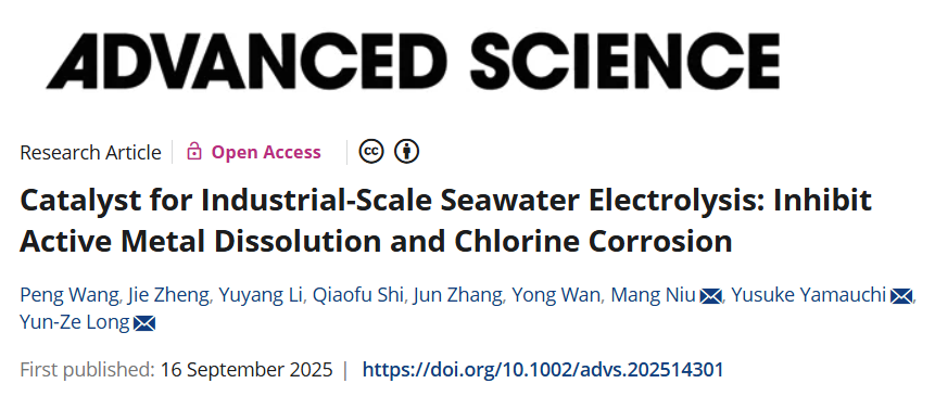 牛莽博士在国际著名期刊《Advanced Science》(2025, e14301)上发表了题为“Catalyst for industrial-scale seawater electrolysis: Inhibit active metal dissolution and chlorine corrosion”(工业级海水电解催化剂:抑制活性金属溶解和氯腐蚀)的研究论文。《Advanced Science》(先进科学)最新SCI 影响因子为14.1。论文第一作者为博士研究生王蓬和青年教师郑杰博士,通讯作者为做爱直播