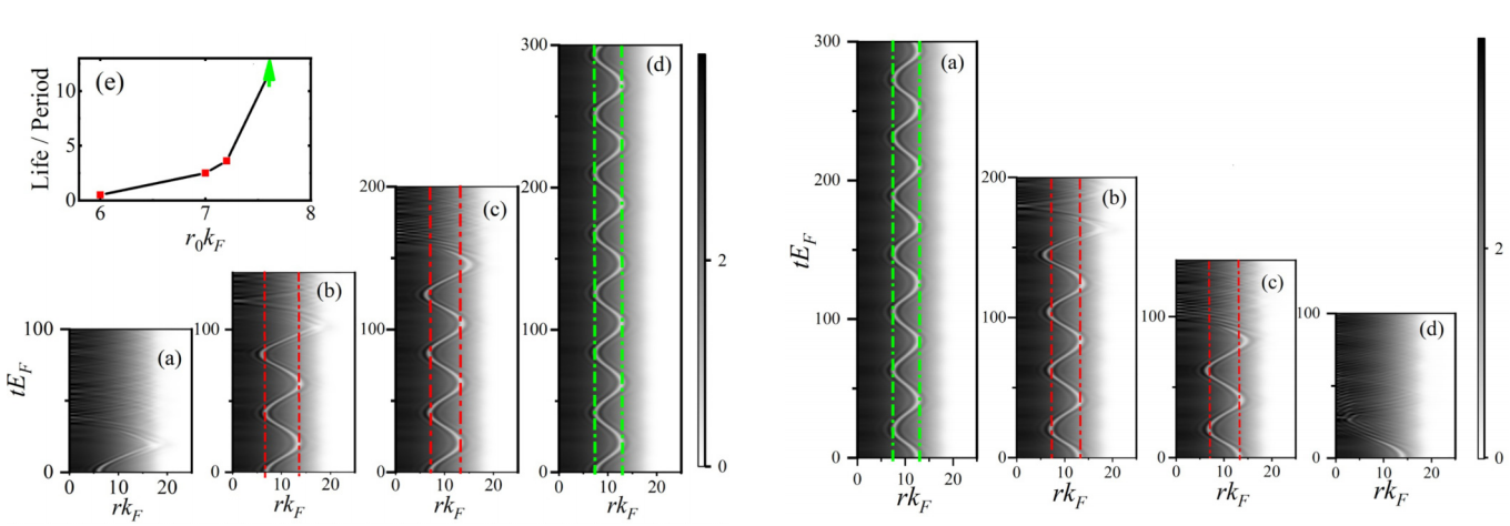 同时,作者们还发现当环形孤子的Friedel振荡半径与环形孤子半径相当或者更大时,环形孤子会通过逐步向外辐射声子而获得加速,最终完全退变。只有当环形孤子的半径足够远离Friedel振荡半径,环形孤子才不会向外辐射声子。即使不被制备在稳定位置时也只会发生围绕在稳定半径附近的周期性振荡行为。