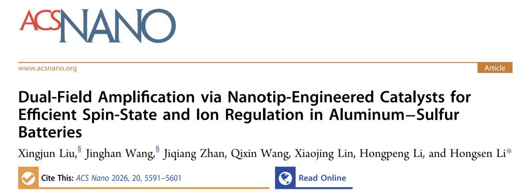 李洪森教授课题组在研究外磁场调节自旋态协同尖端效应催化铝硫电池取得重要研究进展。相关原创性研究成果以《Dual-Field Amplification via Nanotip-Engineered Catalysts for Efficient Spin-State and Ion Regulation in Aluminum-Sulfur Batteries》为题在国际顶级学术期刊《ACS Nano》在线发表。硕士研究生刘星君为论文的第一作者,李洪森教授为通讯作者,做爱直播